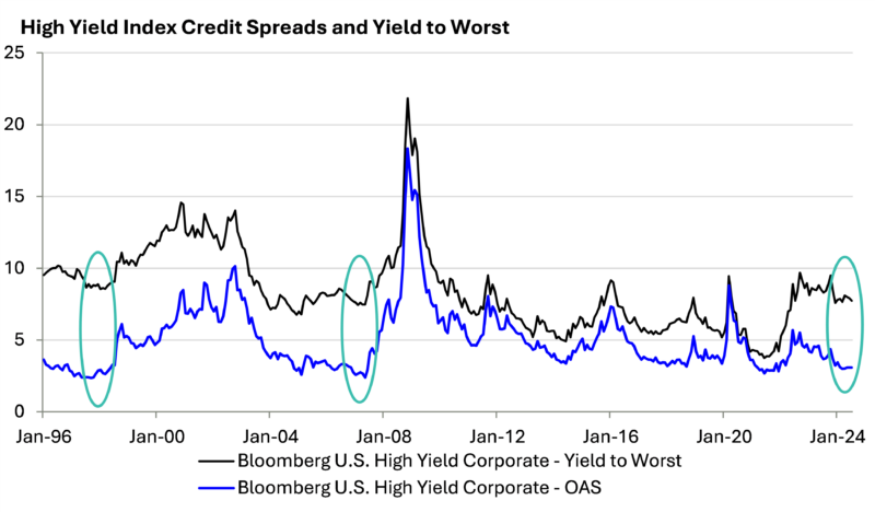 The 2010s were marked by very low yields and mostly tight spreads outside of a few stressful periods, but High Yield generally performed well during the low and slow recovery from the 2008 crises. The late 1990s and mid-2000s provide a more apt comparison to today. In both periods, the Fed had finished hiking rates and was preparing to cut them, and economic growth had softened or was just about to.