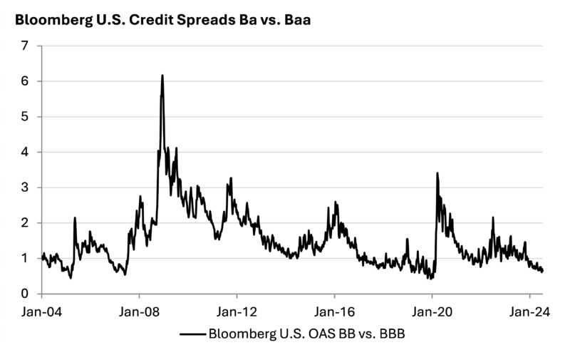 In addition, the spread “give up” for moving up in credit quality is just about as small as it’s ever been, as shown below by the spread between the lowest grade part of the Investment Grade index (Baa) and the highest grade part of the High Yield index (Ba).