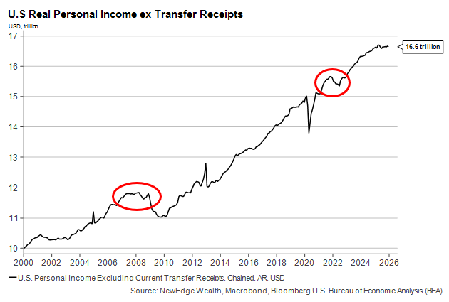 Both periods are noted with red circles on this graph. The 2008 example, in which savings rates were low and household balance sheets were stretched, obviously ended in recession (not primarily because of the commodity price impact, we should note). The 2022 example, in which consumers came into the spike in far better shape, did not. Personal savings rates today are as low as they’ve been outside of 2021 (when stockpiles of savings were still massive) and the mid-2000s.