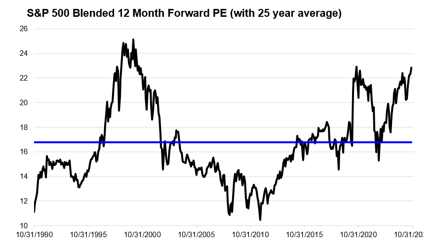 The S&P 500’s full valuation, waving at us from such great heights at 22.8x forward, is expensive by all definitions (relative to its own history, relative to other equity markets, and relative to other assets, like bonds), but the reality is that the S&P 500 has been expensive for quite some time and this richness has not yet acted as dampener on returns (we have written extensively about how valuations are not a helpful timing tool and how valuations impact on forward returns is highly path dependent).