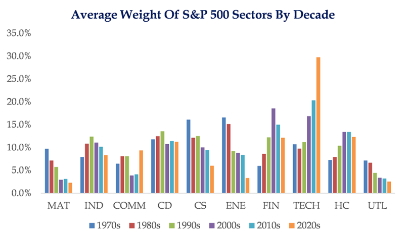 Examples of this include arguments like this Bloomberg article asserting that if you remove all the expensive names, the index isn’t that expensive (!), or that technology will provide such a huge boost to productivity and earnings growth that valuations aren’t that high today, or how today’s greater weight of high quality technology names in the index makes historical comparisons of valuations less relevant (see the chart below).