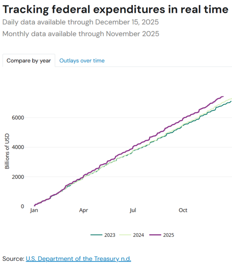 1. DOGE’s Day in the Sun: 2025 opened with a blitz of efforts to curtail U.S. federal spending. It started with layoffs and buyouts for hundreds of thousands of employees and eventually sprawled out to include the shuttering of entire agencies. Ultimately, the Department of Government Efficiency (DOGE) shuttered without making a dent in the rate of growth of federal spending. Austerity and efficiency do not appear to be on the agenda in 2026, either. Though bond vigilantes seem to remain in hibernation, the potential for even wider deficits in 2026, as promises are made in a midterm election year, may stir deficit hawks from their slumber.