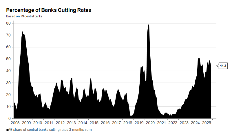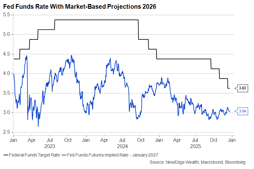 3. Global Easing Cycle into a Resilient Growth Backdrop is Slowing: Both 2024 and 2025 have been years of global central bank easing, all while overall global GDP growth remained near 3%. This kind of concerted easing without economic weakness has been a powerful backdrop for global risk assets, which enjoyed the added liquidity and the resilient growth expectations. Going into 2026, multiple developed market central banks are set to pause their easing cycles (even the Fed, which is currently expected to cut rates two more times in 2026, had its Chairman say that rates were “effectively” at neutral), unless, of course, more pronounced economic weakness were to develop, but this would be less welcome by risk assets.