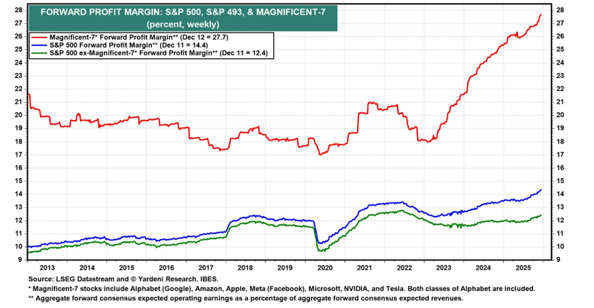 1. Magnificent 7 Earnings vs. Everyone Else: The last three years have been incredibly powerful for Magnificent 7 earnings growth. While the “average stock” (the equal weight S&P 500) has grown earnings by a meager 16%, the Magnificent 7 has delivered an astounding 200% earnings growth (as shown in the first chart below). The question for 2026 is if the extraordinary margin expansion of the last three years from the Magnificent 7 (as seen in the second chart below that shows 10 percentage points of margin expansion over the last three years) can be sustained going forward as these companies spend more money on capex and face steeper competition from new innovative entrants. Further, consensus is expecting a substantial rebound in “everything else” earnings growth in 2026.
