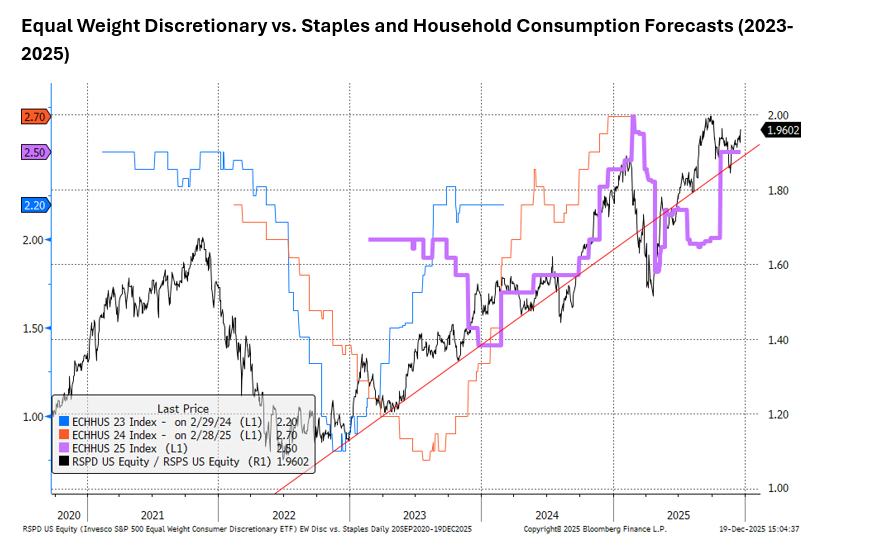 2. The Equity Market’s Signal About the Consumer: For all of the consternation about the US consumer over the last year (poor sentiment readings, clear divergences in financial health of high and low income households), the equity market was clear in its signal that it judged the aggregate US consumer (which benefits from the large weight of healthy, high income households) was still resilient. The ratio of Equal Weight Discretionary vs. Staples stocks, a barometer of cyclical vs. defensive or risk on vs. risk off for the US consumer, remains in an uptrend, suggesting continued expectations for resilient aggregate household consumption.