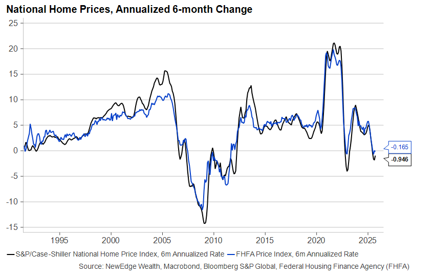 4. Housing Remains in the Doldrums: Mortgage rates have come down a little and sales have picked up, but prices are under pressure and builders have stopped hiring and are taking on fewer new projects. Home prices are not likely to collapse in 2026, but households are no longer feeling the powerful tailwind of the wealth effect from their home values. What could change this in 2026? A rapid increase in supply seems unlikely, and a significant but benign (i.e., no recession) drop in interest rates may be too much to hope for.